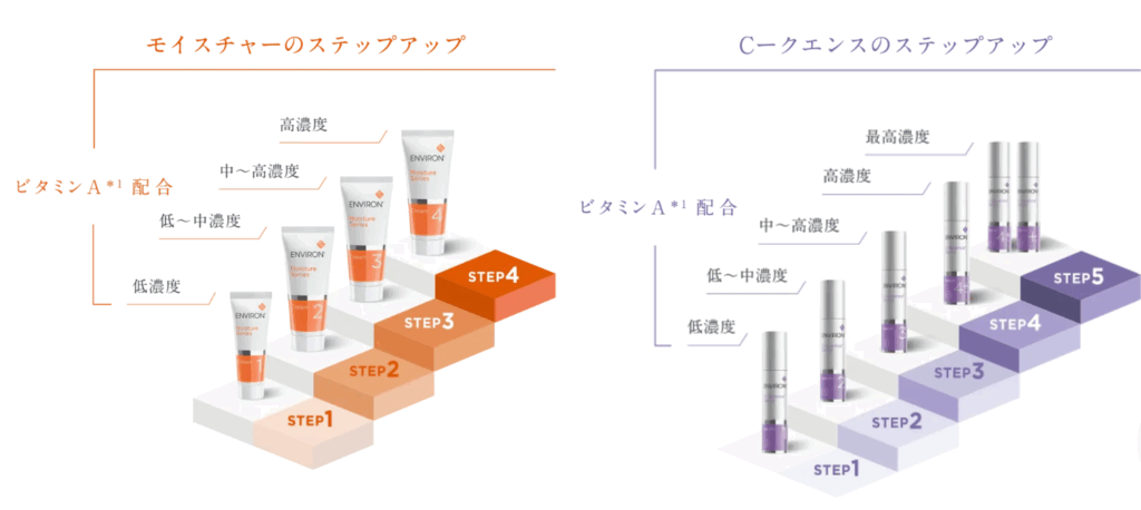 - 低濃度のビタミンA(モイスチャーシリーズ1番など)からスタート